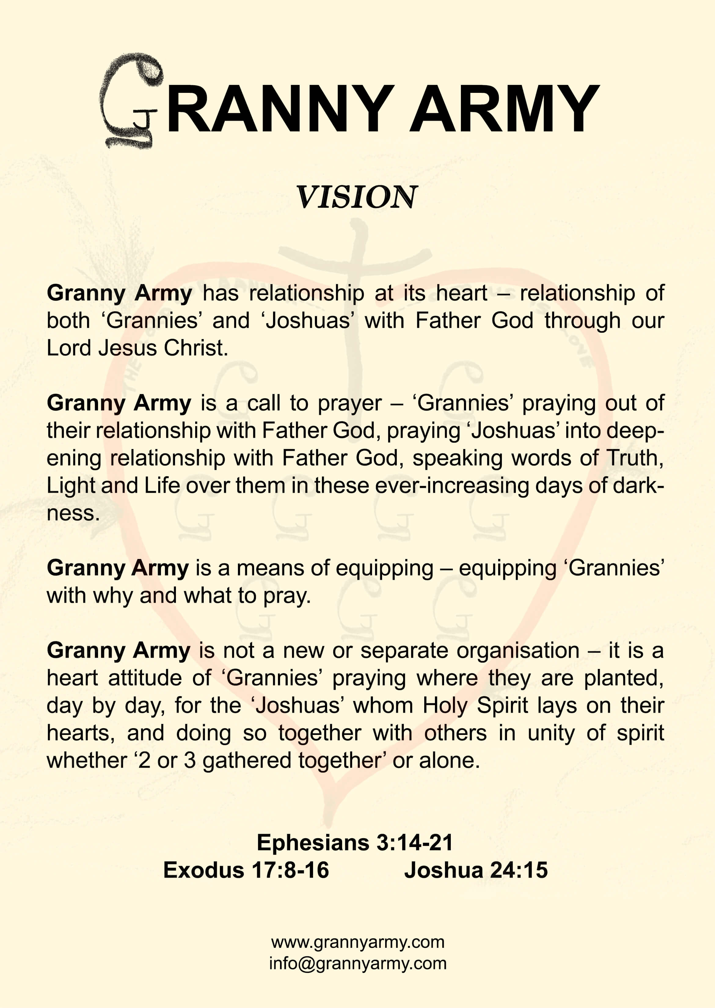 Granny Army is not a new or separate organisation – it is a heart attitude of ‘Grannies’ praying where they are planted, day by day, for the ‘Joshuas’ whom Holy Spirit lays on their hearts, and doing so together with others in unity of spirit whether ‘2 or 3 gathered together’ or alone.
