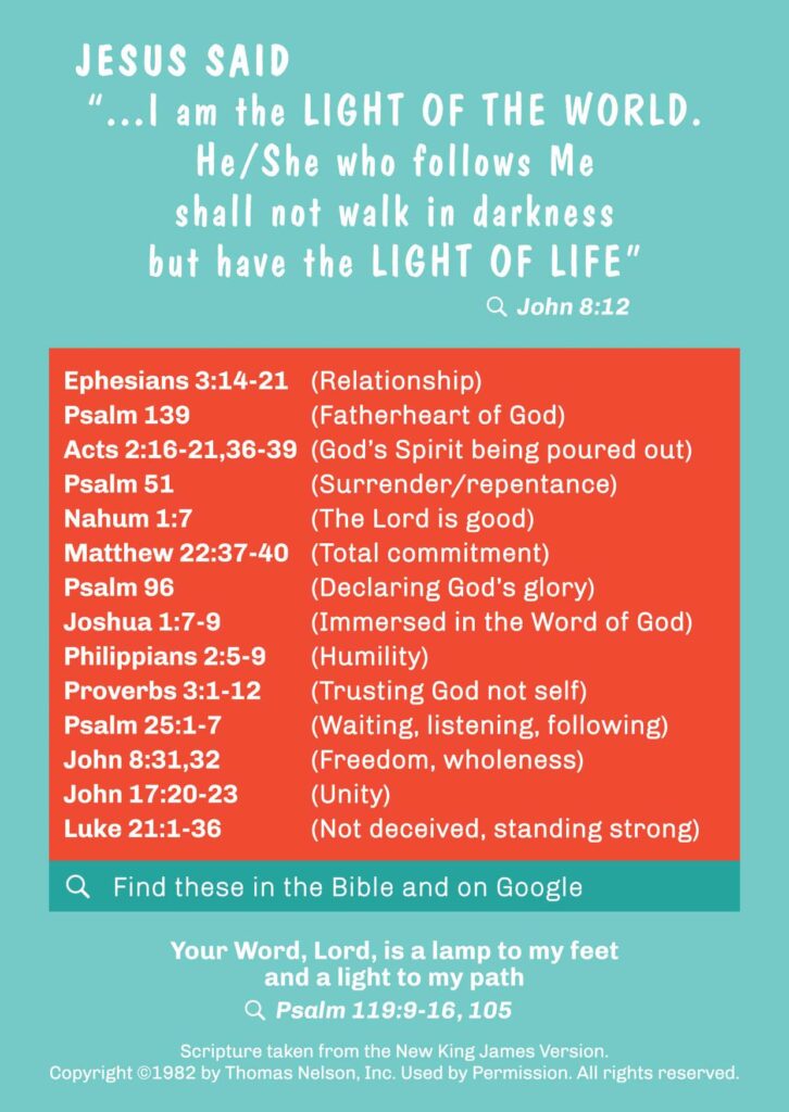 Ephesians 3:14-21(Relationship) Acts 2:16-39(Spirit of Truth being poured out) Psalm 139(Fatherhood of God) Psalm 51(Surrender/repentance) Joshua 24:14,15(Choice) Matthew 22:37-40(Total commitment) Psalm 96(Worshipping the Lord in holy splendour) Joshua 1:7-9(Immersed in the Word of God) Philippians 2:5-9(Humility) Proverbs 3:1-12(Trusting God not self) Psalm 25:1-7(Waiting, listening, following) John 8:31,32(Freedom, wholeness) John 17:20-23(Unity) Luke 21:1-36(Not deceived, standing strong)